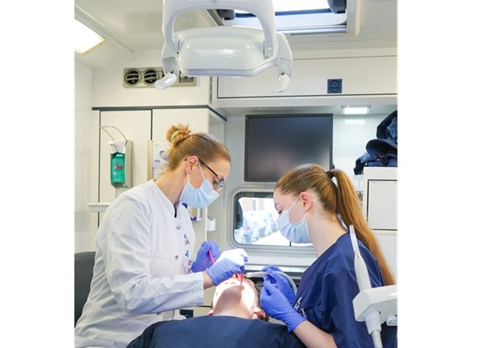Das Zahnmobil befindet sich in einem umgebauten Rettungswagen. Es werden zahnärztliche Behandlungen für Patientinnen und Patienten angeboten unabhängig davon, ob sie krankenversichert sind oder nicht.